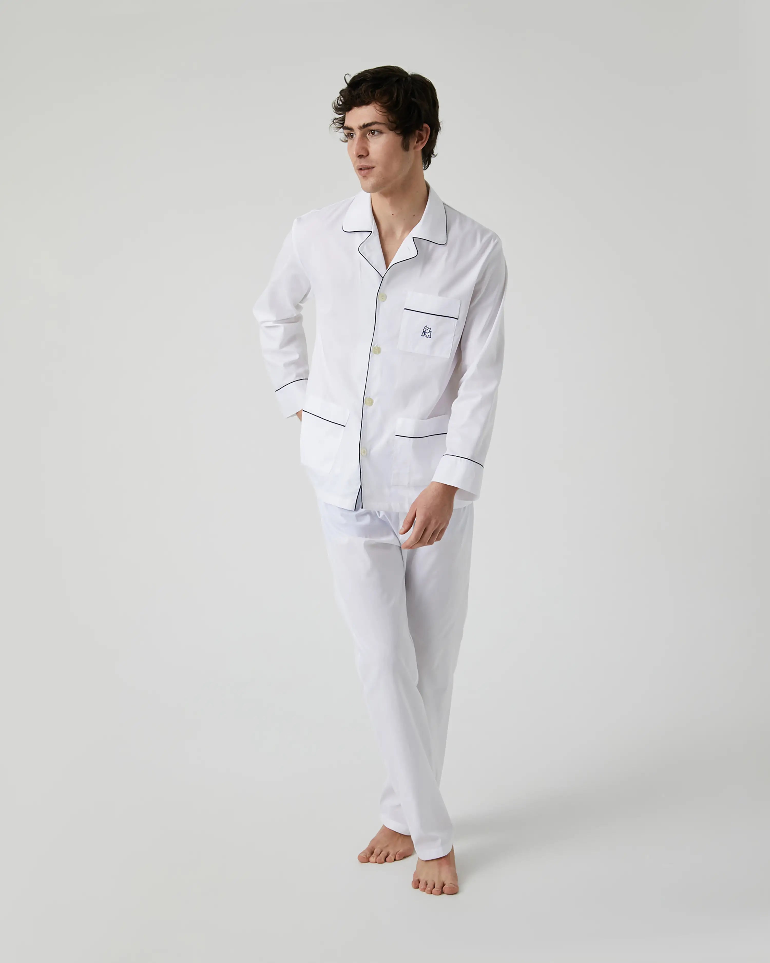 Pijama largo de tela de algodón blanco. Chaqueta ribeteada con vivo azul marino, tiene tres bolsillos, y logotipo de la marca bordado en el bolsillo del pecho. Pantalón coordinado con cintura elástica